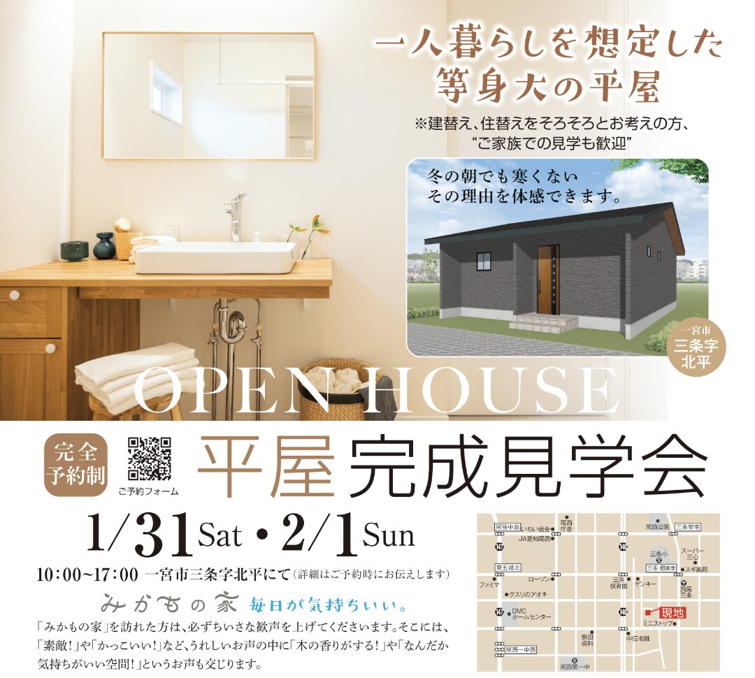 【完成見学会】の見どころ! 来る1月31日(土)、2月1日(日) 2日間開催 【完成見学会】詳しくは 完成見学会~将来まで暮らしやすい等身大の平屋~ | 一宮市の戸建て住宅・土地売買・不動産は株式会社三鴨地所 投稿日:2026.01.15