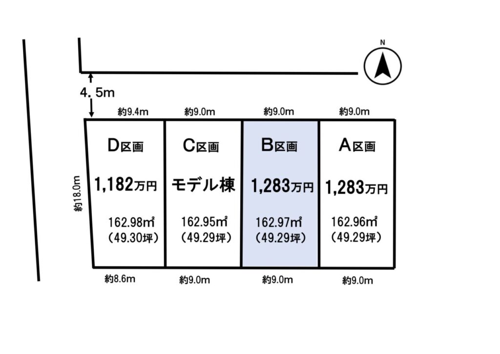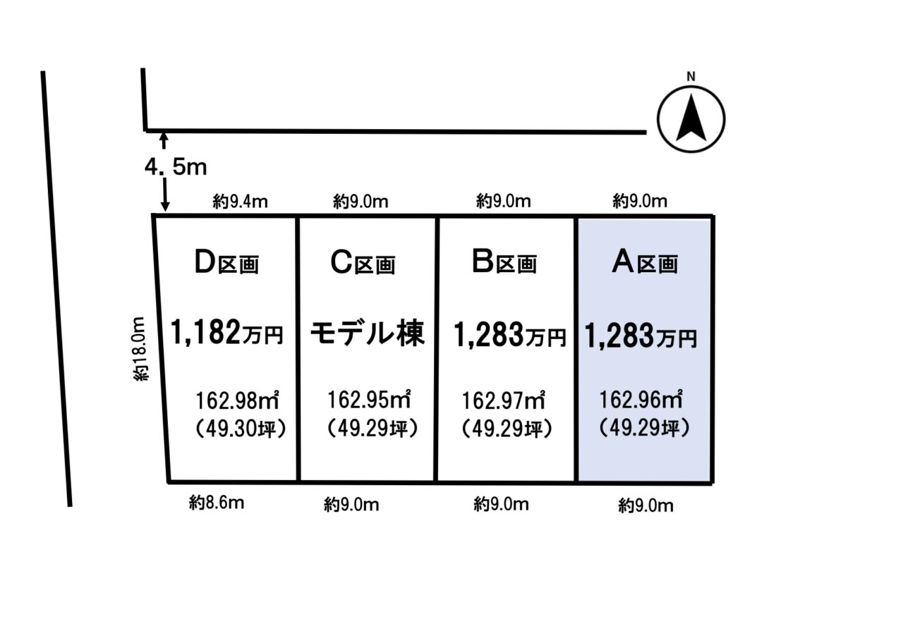 | 土地面積 | A区画162.96㎡(49.29坪)/B区画162.97㎡(49.29坪)/D区画162.98㎡(49.30坪) |