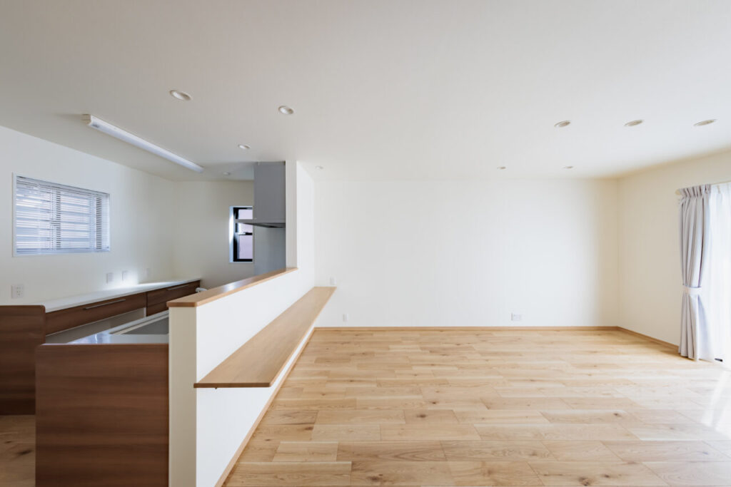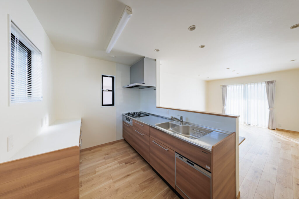 フロアキャビネットとシステムキッチンの間は広くとります